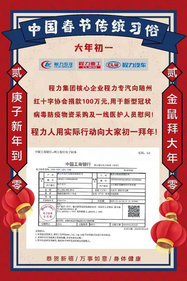 導(dǎo)讀:湖北程力集團(tuán)向隨州市紅十字會(huì)捐贈(zèng)人民幣100萬元,用于抗擊新冠肺炎疫情。此外,該公司正在抓緊調(diào)配設(shè)備,趕制負(fù)壓救護(hù)車,助力早日打贏這場沒有硝煙的戰(zhàn)爭。“各…