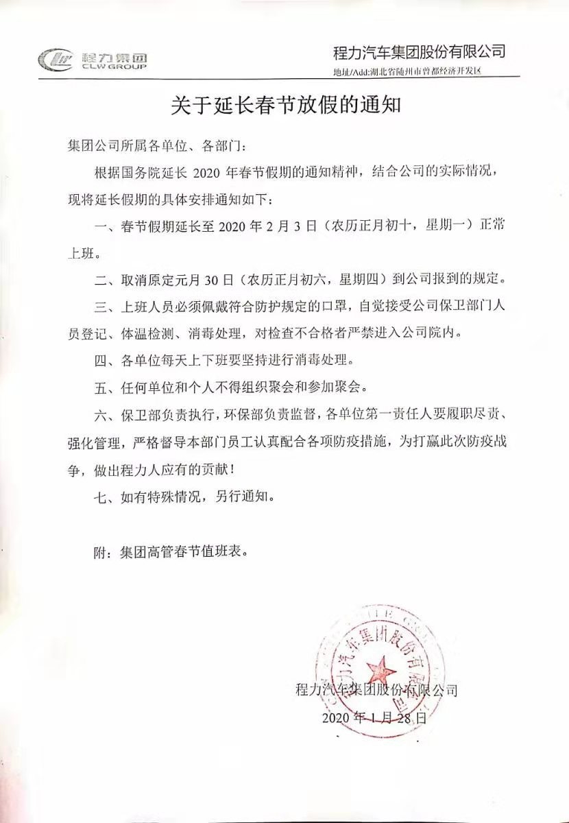 湖北程力汽車集團關(guān)于延長2020年春節(jié)放假通知