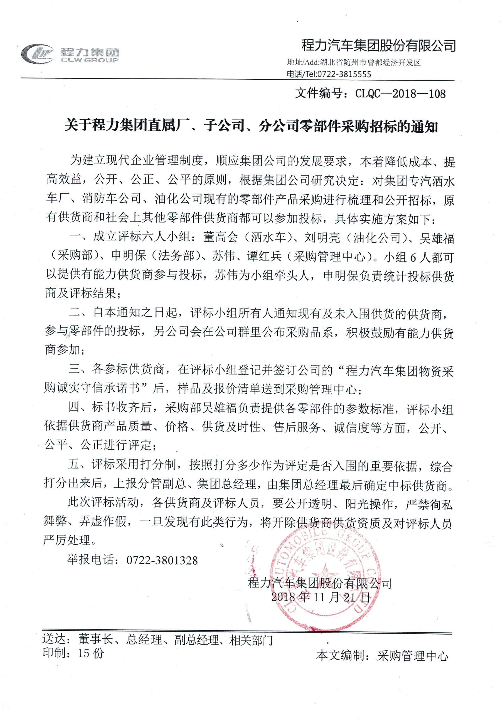 關于湖北程力汽車所有零部件招投標活動公示:湖北程力公司正在進行所有程力公司所用的所有零部件及配套件(含所有的灑水車、環衛車、化工車、消防車、罐式車等)…