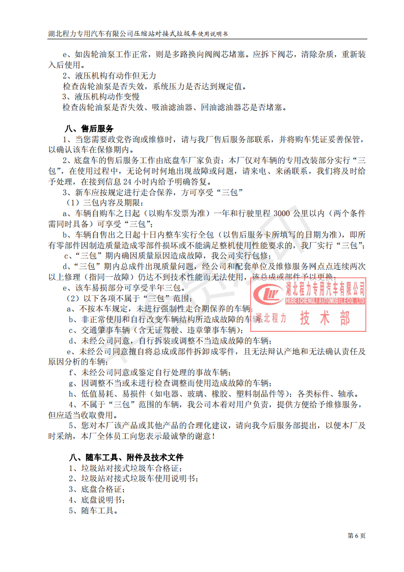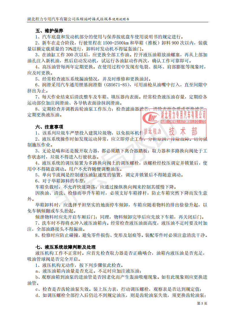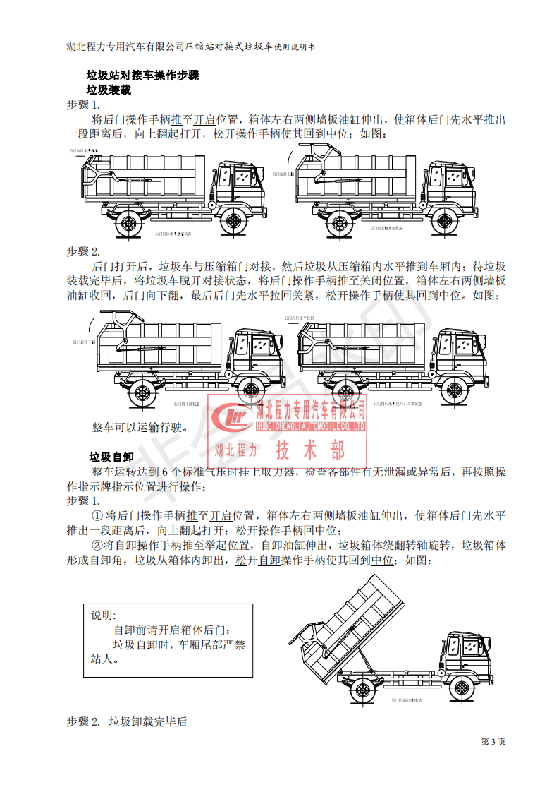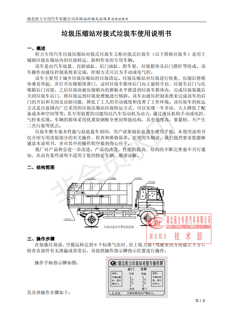 湖北程力垃圾壓縮站對(duì)接式垃圾車使用操作說明書