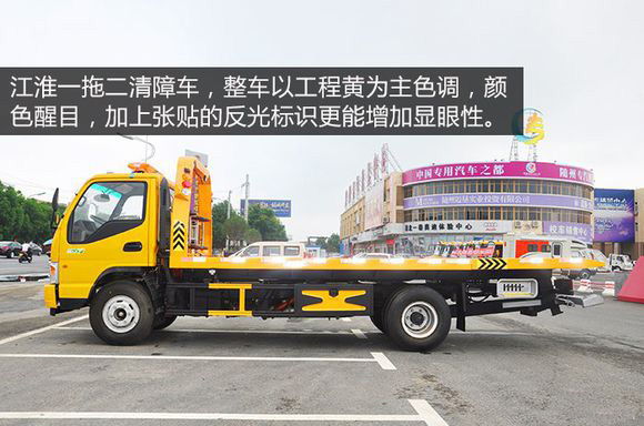 導讀:江淮平板一拖二清障車,整車以工程黃為主色調,顏色醒目,加上張貼的反光標識更能增加顯眼性,(如圖,在閃光燈的拍攝下反光出的效果)即使在北方冬季大雪的情況下…