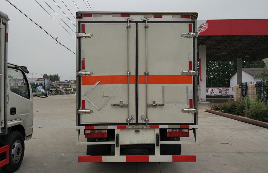 1、廂體部分:廂體為雙層金屬骨架結構,外部為冷扎鋼板,內壁采用鋁合金板蒙面,夾層為隔熱阻燃材料填充。設置對開門,側壁設有防雨功能自然通風窗口,以使廂內外空氣流動,廂體內部做防靜電處理,廂體底部與廂內前部鋪有阻燃導靜電膠板,并與底盤等電位連接,通過車輛后端的導靜電裝置與大地相連,可防止靜電火花的產生和車輛靜電及時釋放,提高易燃氣體廂式運輸車的安全性。廂體內部前面和側面裝有固定拉環,與捆綁帶使用捆綁貨物以避免移動,保證安全。