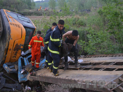消防官兵到達現場后,發現一輛貨車車頭直接扎入溝中,在貨車上的挖掘機側翻在一旁,當地派出所及120急救人員已經趕到了現場。見此情形,消防官兵迅速展開營救,但由于貨車狠狠的撞在田埂上,駕駛室已經嚴重變形,消防官兵利用液壓剪擴鉗、液壓撐頂器等破拆工具均未能使駕駛室有效擴張,而且挖掘機隨時有壓下來的危險。于是,中隊指揮員立即協調公安部門,將附近的一輛挖掘機借調過來,配合消防官兵實施營救。