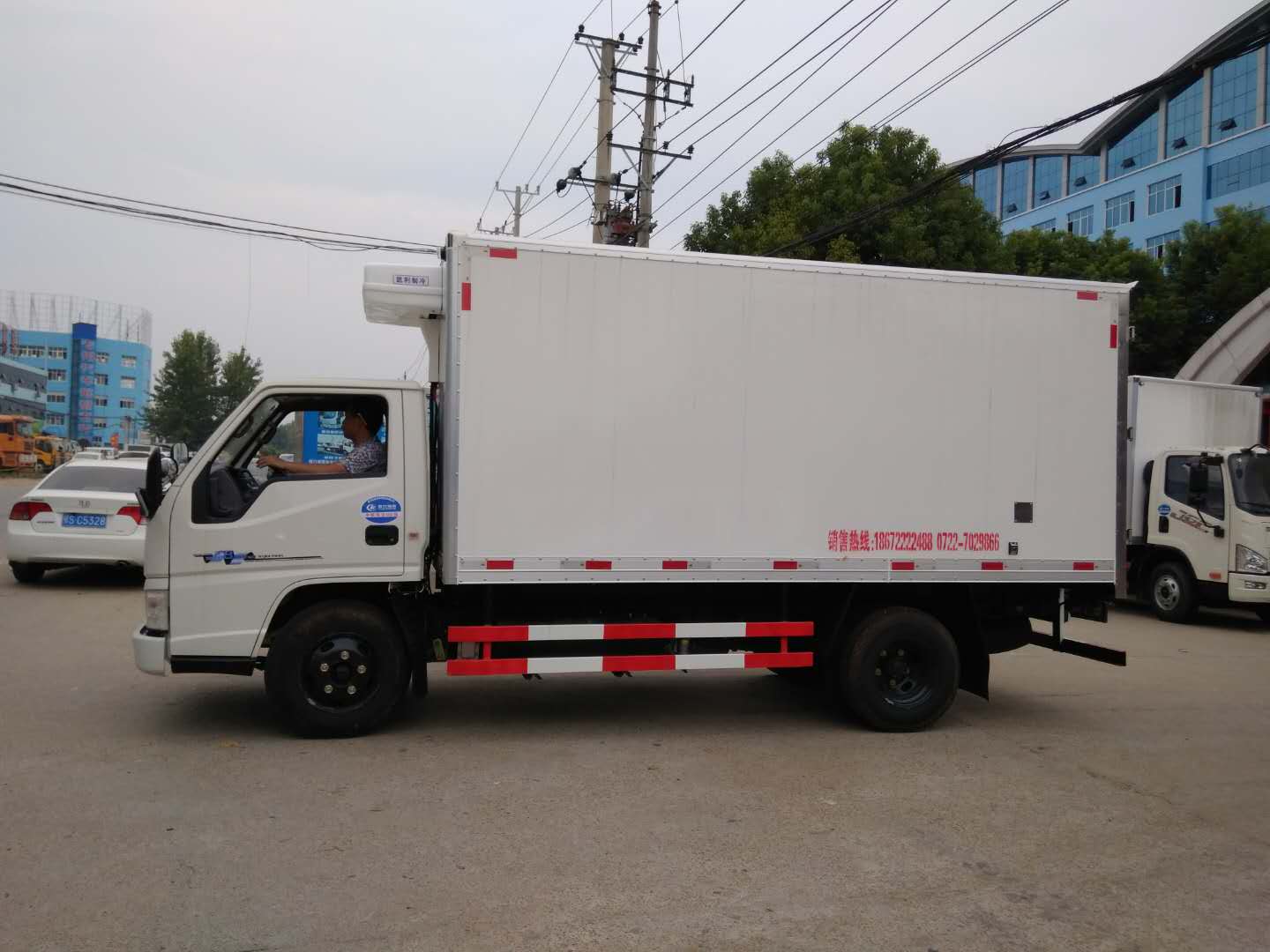 3.上裝配置:冷藏廂內部有效尺寸:長4.15米×寬1.75米×高1.75米,廂體蒙皮采用內外玻璃鋼,隨客戶選擇內置槽鋼焊接骨架或者玻璃纖維超輕高強度骨架,填充8cm聚氨酯保溫層,不銹鋼包角,不銹鋼門框,不銹鋼門鎖件,配后雙開門,選裝側門,防滑花紋鋁底板,-5或者-18度制冷機組可選。可以改裝成藥品冷藏車或者安裝導軌,肉鉤,通風槽等內部設施改裝成肉掛車。