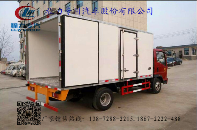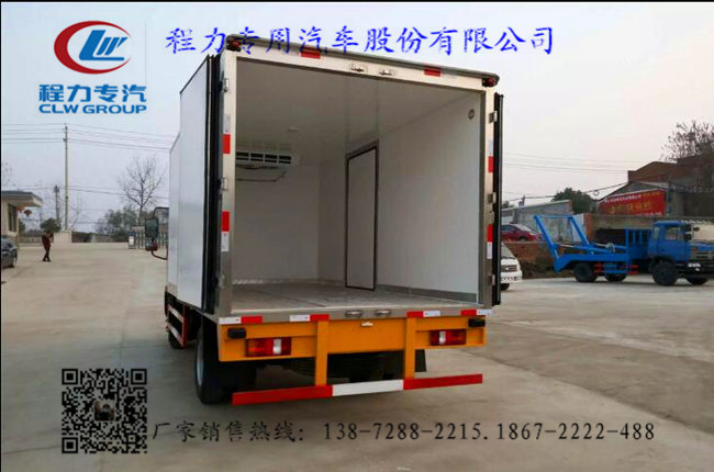3.上裝配置:廂體內部有效尺寸:單排長4.1米/排半長3.7米×寬2.15米×高2.15米,內外玻璃鋼,隨客戶選擇內置槽鋼焊接骨架或者玻璃纖維超輕高強度骨架,填充8cm厚聚氨酯保溫,不銹鋼包角,不銹鋼門框,不銹鋼門鎖件,花紋鋁底板,配后雙開門,該車可選裝單側開門,安裝-5~-18度制冷機組可以選擇。選裝進口制冷機組,選裝肉鉤,導軌,通風槽;